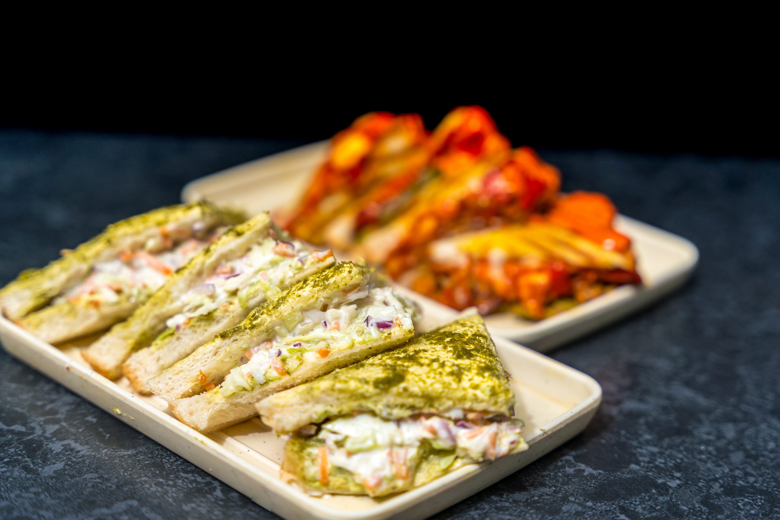 A two layer sandwich with savoury spiced paneer masala and veg coleslaw fusioned with an aromatic herb chutney and cheese.