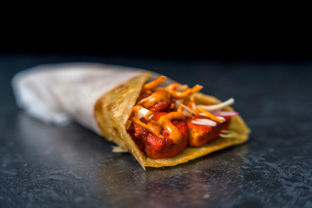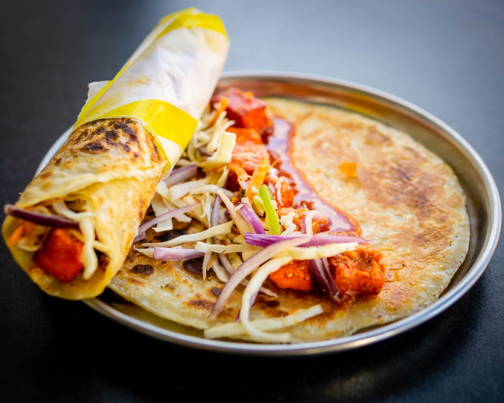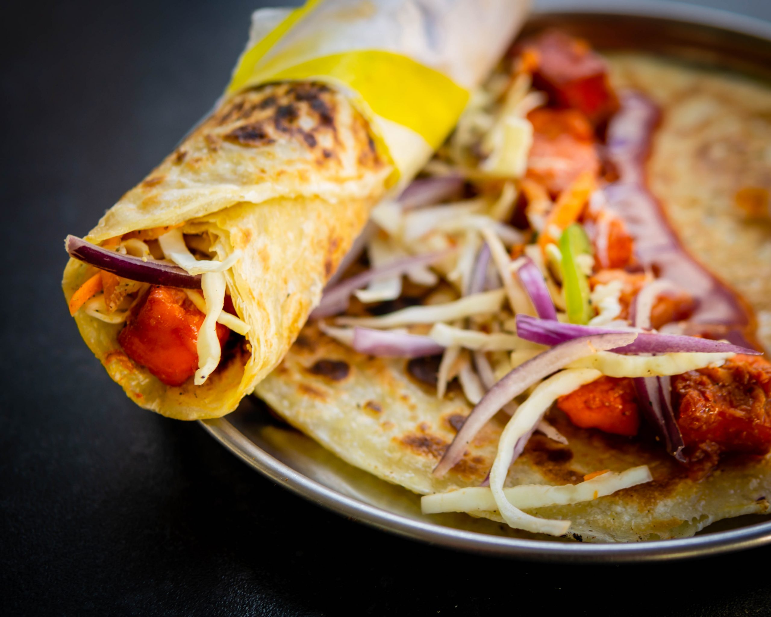 A flakey frankie filled with flavourful paneer masala, salad and house made hot and sweet sauce.