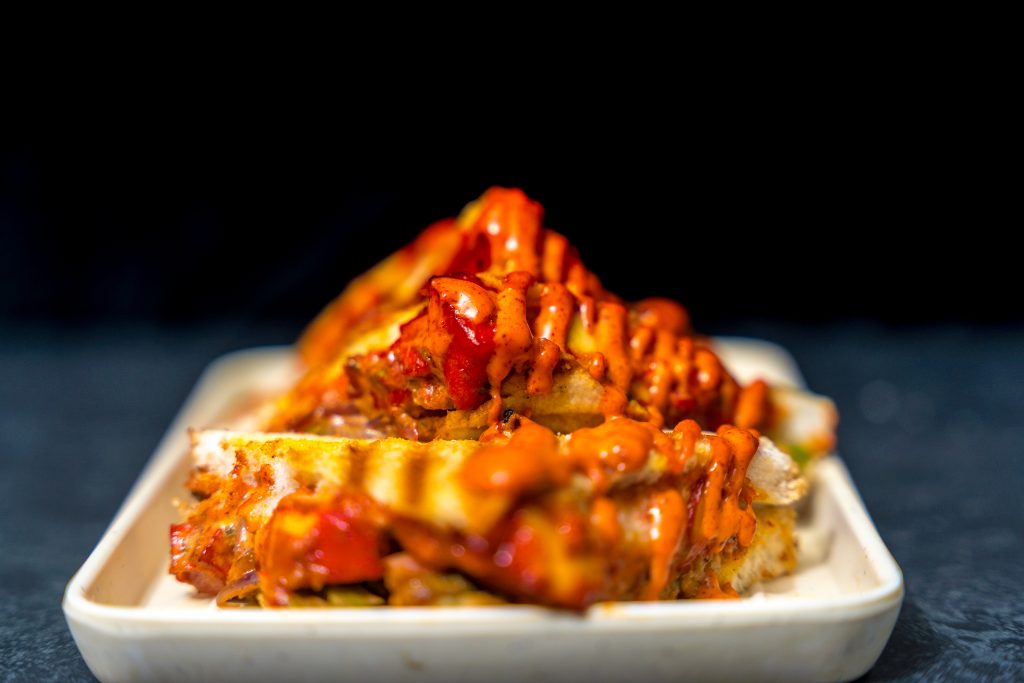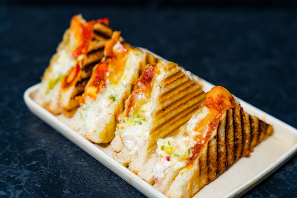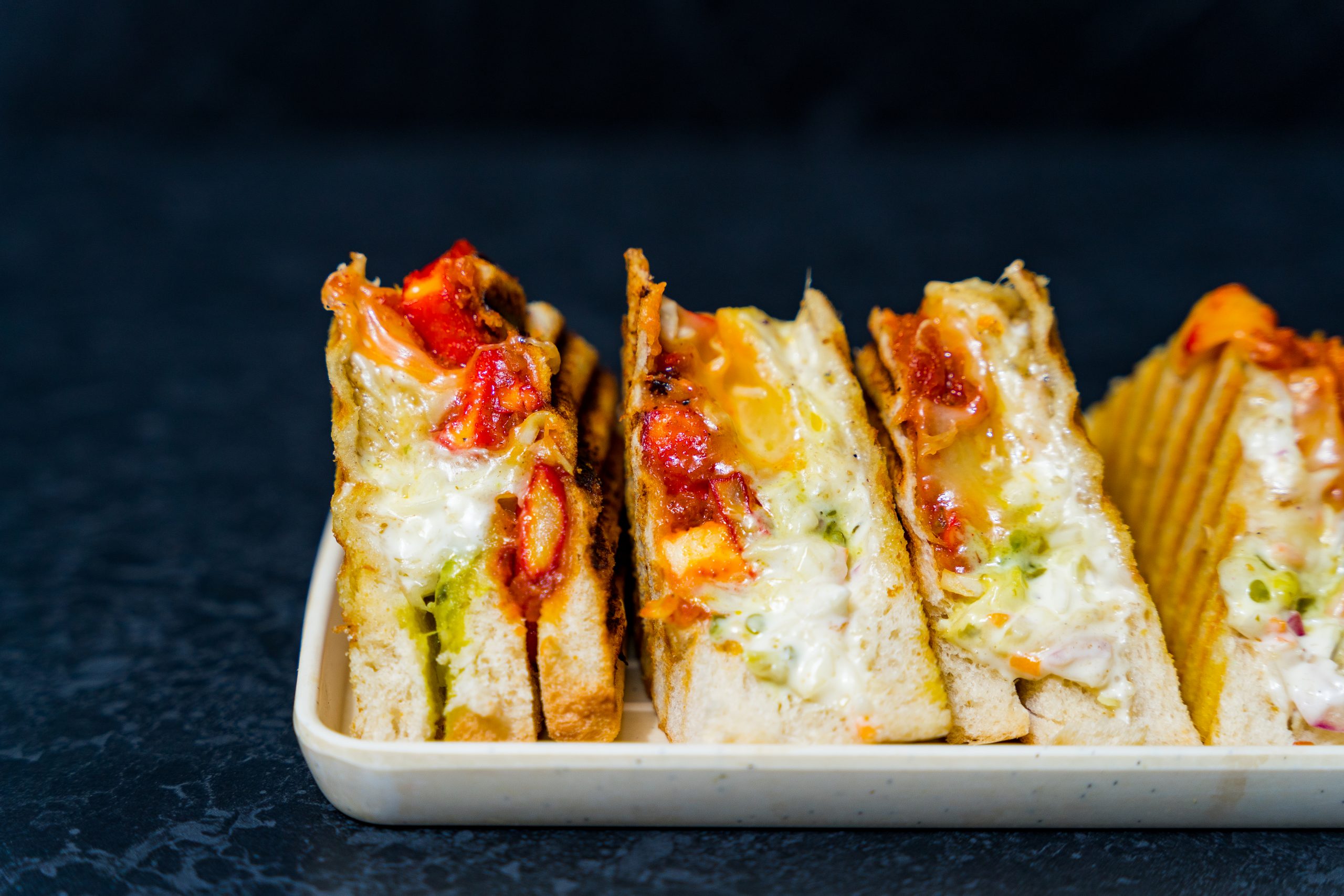 Classic toastie filled with savoury spiced chicken masala, veggies, cheese and green chutney.