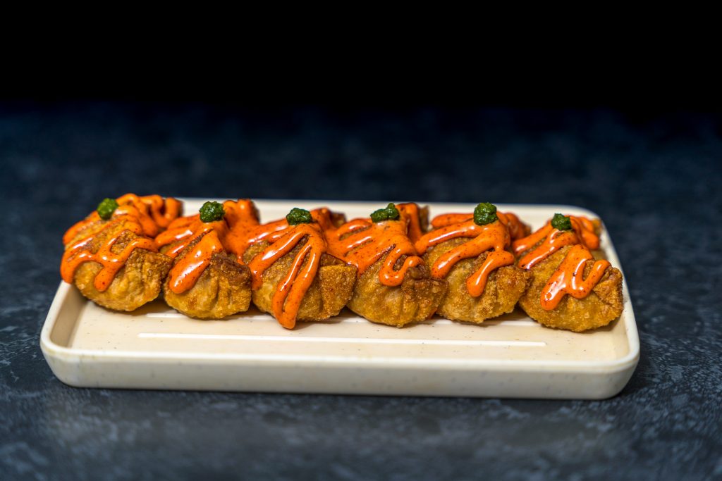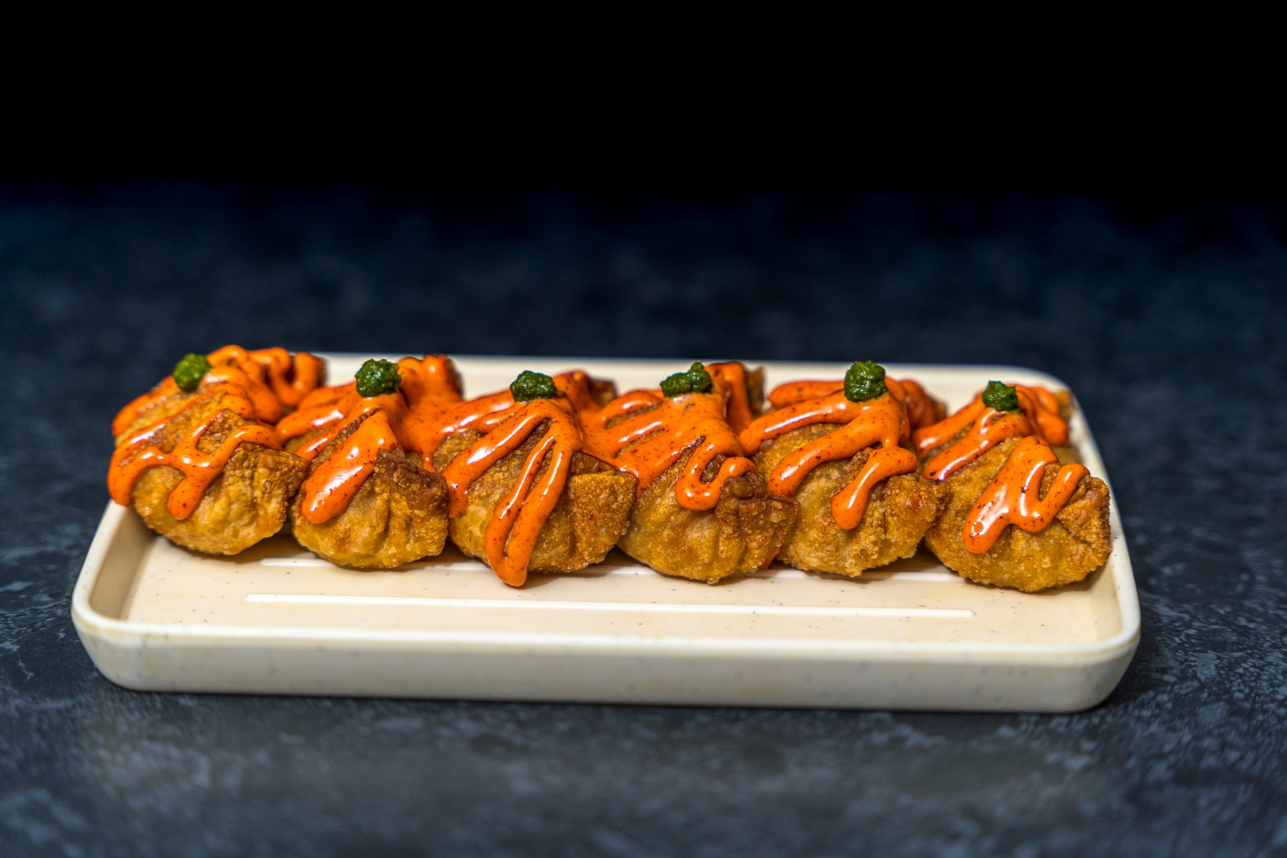 Fried chicken Dim Sums topped with homemade tandoori sauce and green chutney.