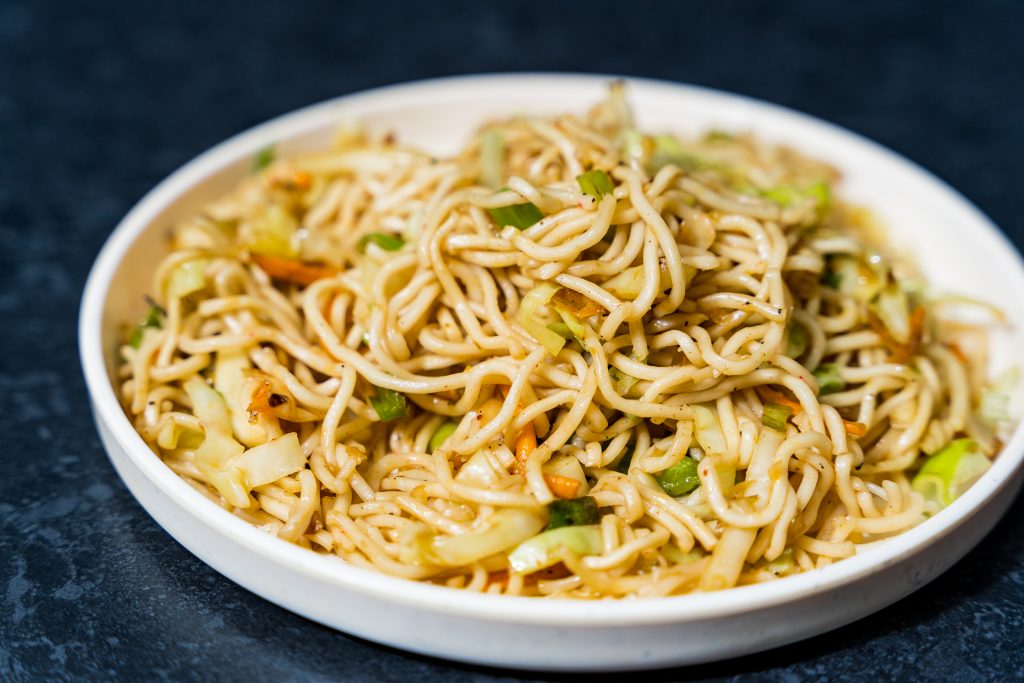 Light fluffy noodles sautéed with shredded veg and finished with soy sauce and seasonings.