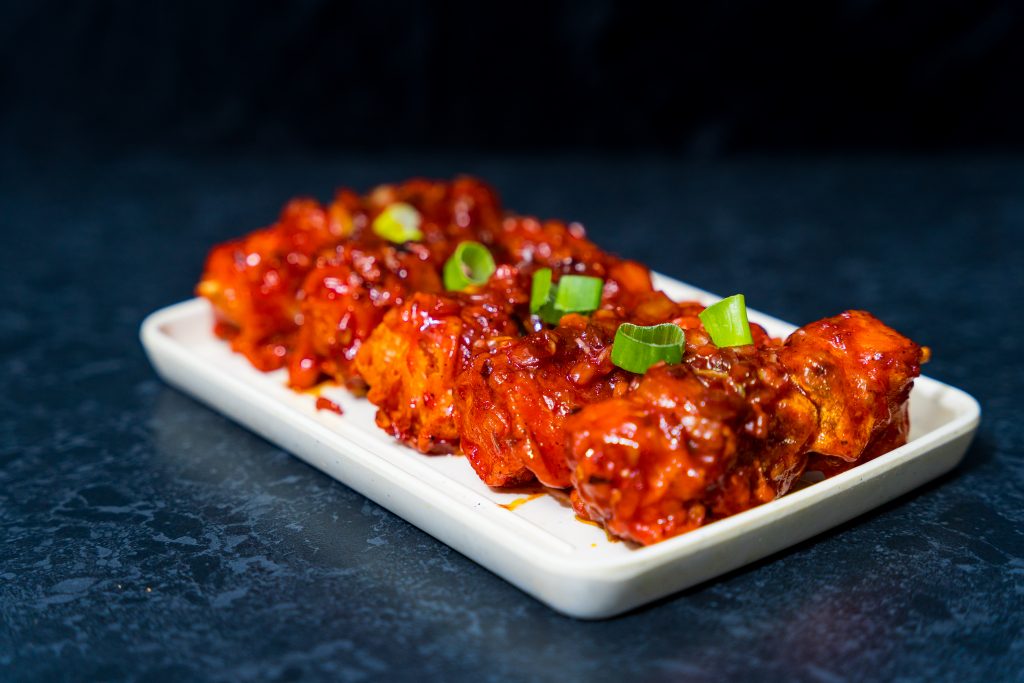 Fried paneer Dim Sums tossed in a chef's secret hot sauce infused with chilli oil.