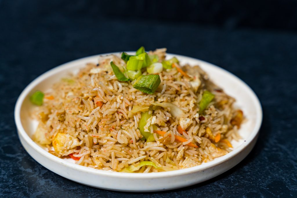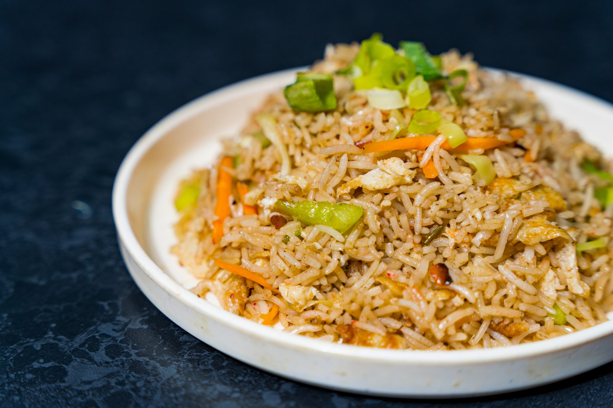 Steamed rice stir fried with shredded vegetables and an egg finished with soy sauce and seasonings.