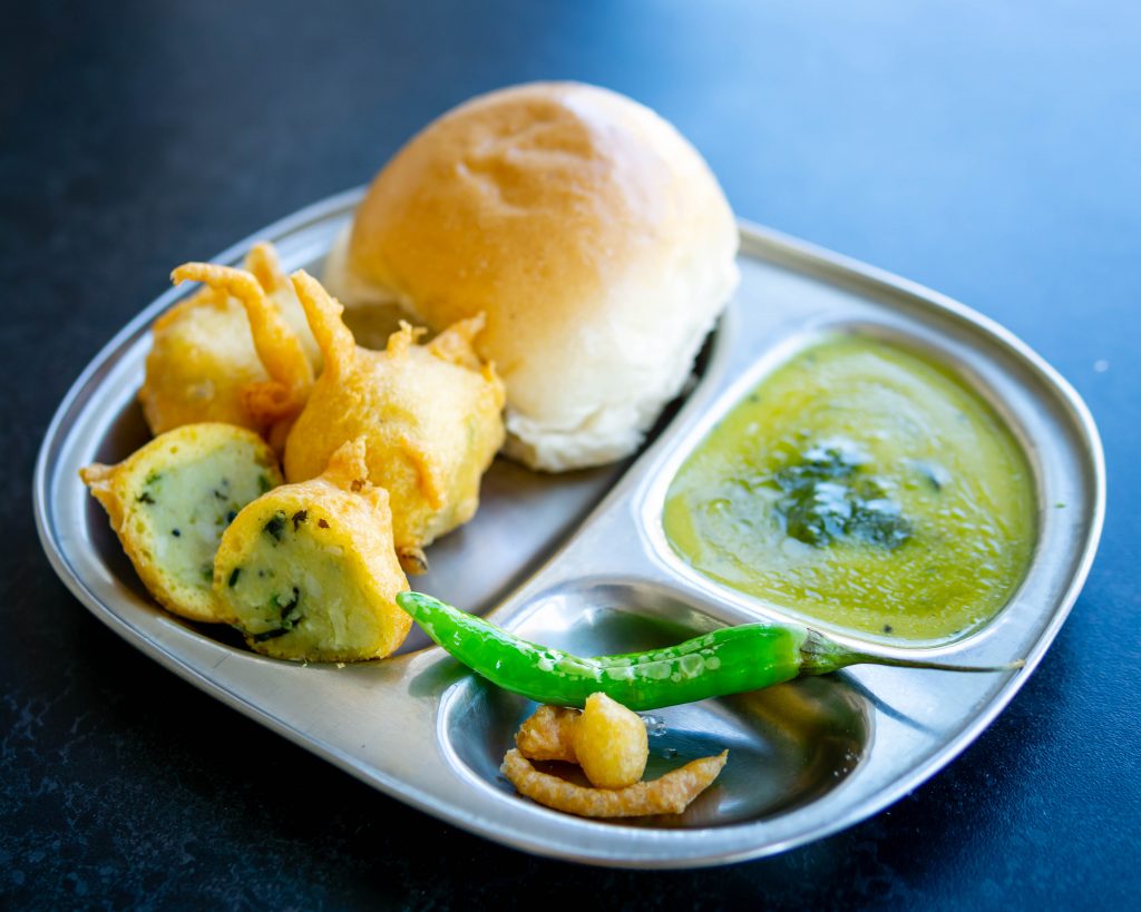 A spicy potato patty (vada) served with soft bread roll (pav), enhanced with sweet and sour chutneys for a perfect balance of flavours. A must-try fusion snack!
