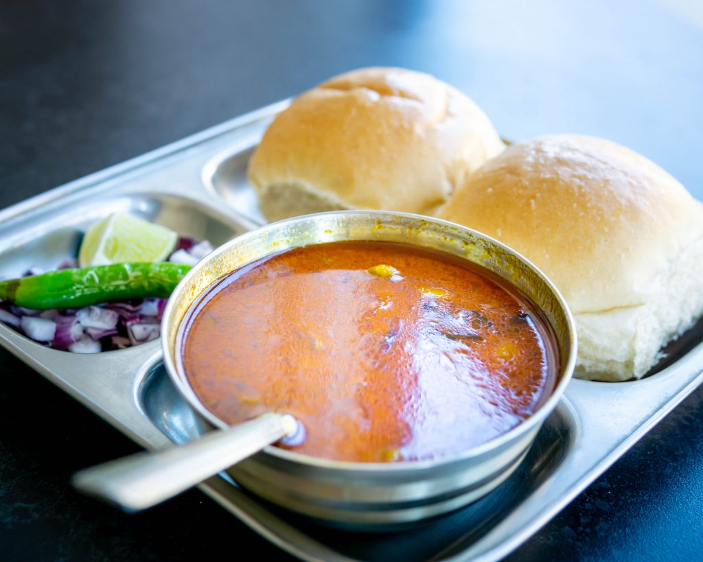 A spicy Maharashtrian curry made with white peas, served with soft pav buns. A hearty and flavorful street food delight.