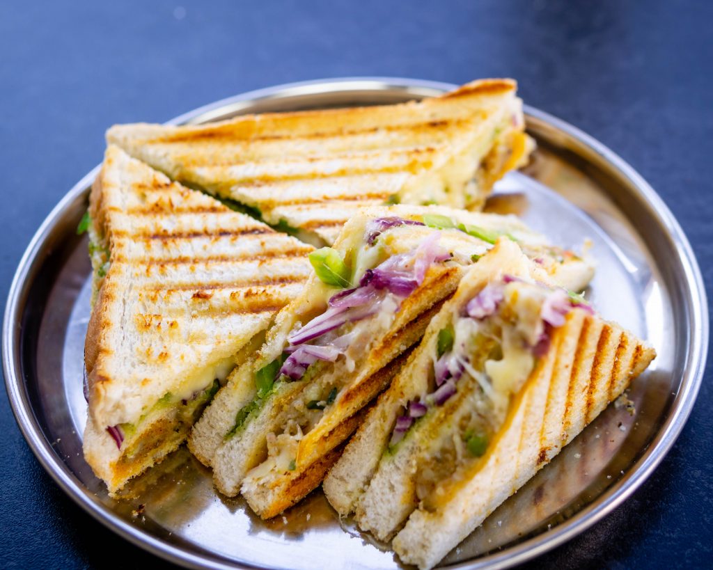 A two layer sandwich with savoury spiced potato and mix veg masala and veggies fusioned with an aromatic herb chutney and cheese.